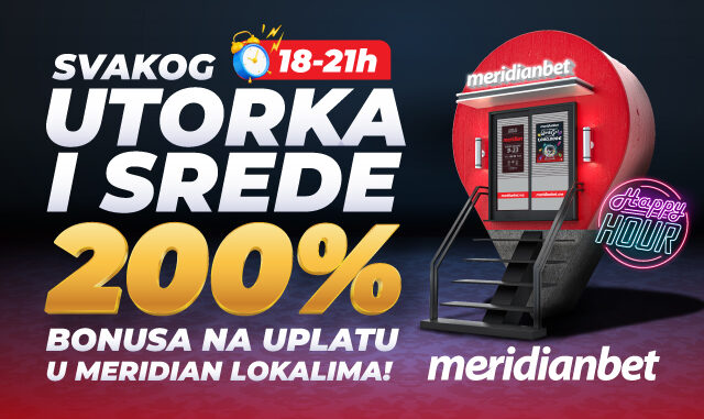 Ali, to nije sve – čeka te i “brdo” bonusa za sportsko klađenje, kao i za slot igre u Meridianu! Svakog utorka i srede, do kraja marta, aktivna je promocija “Happy hour”, u periodu od 18 do 21 čas tokom koje te čeka 100% slot i 100% sport bonusa!