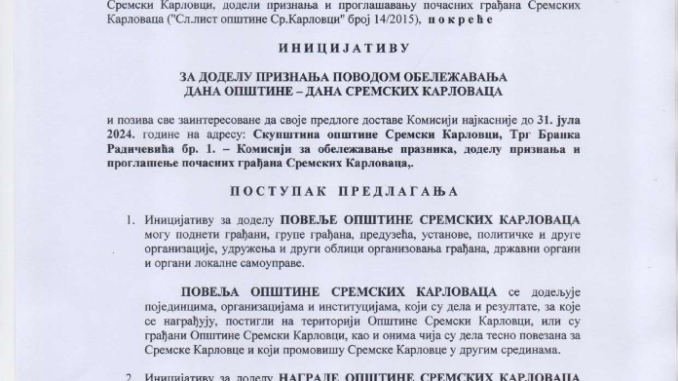 Иницијатива за доделу признања поводом обележавања Дана Општине-Дана Сремских Карловаца admin ИНФО, Сремски Карловци 0